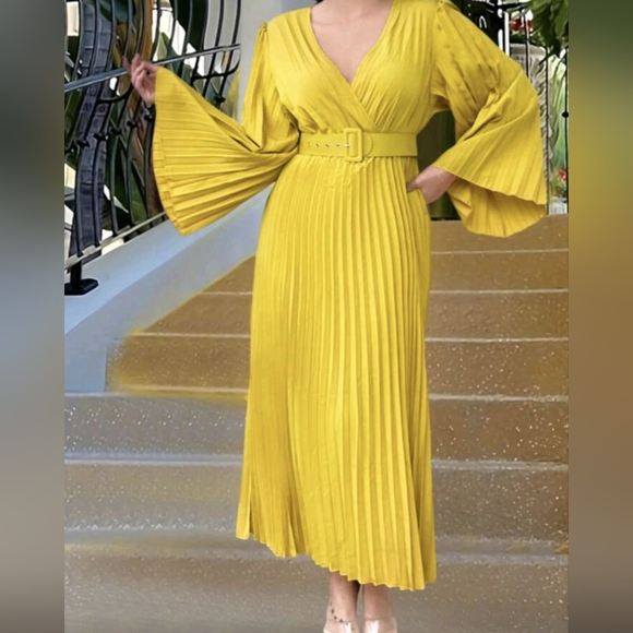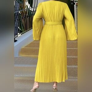 We have a brand new dress with pleated sleeves and skirt. The dress also has a belt. It's a size 16 shein 2x.