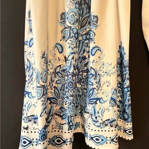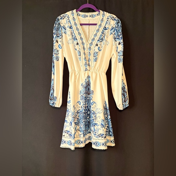 Long sleeved dress. White with blue print and faux pearl buttons. Size large. Worn once.