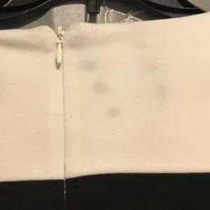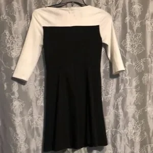 Lovely, black and white A-line dress. Very professional looking. Please see all photos as they are part of the description. There is some discoloration on the back near the zipper and one spot on the sleeve. Not that noticeable. The dresses in good used condition. Three-quarter length sleeves.