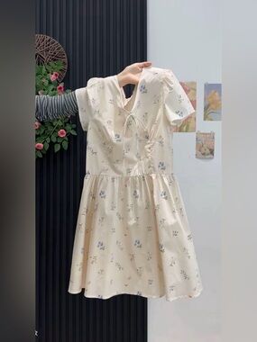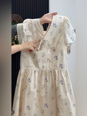 Cream base with small floral print, V-neck with tie, puff sleeves, and flowy skirt.