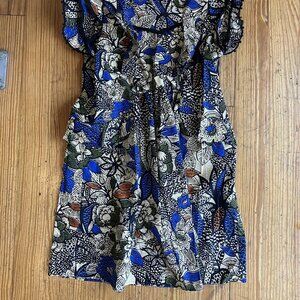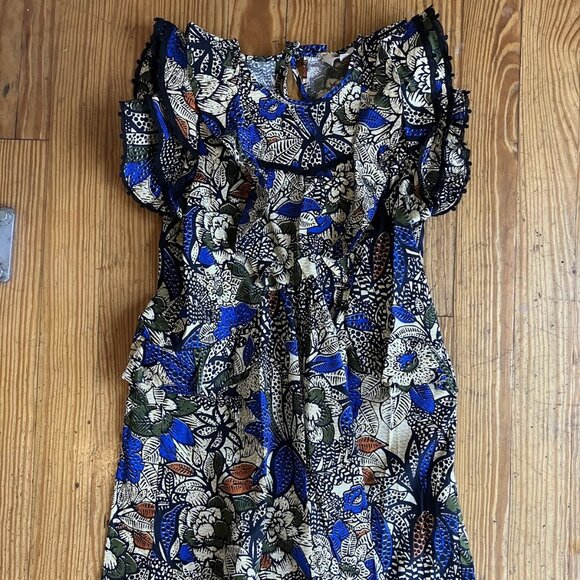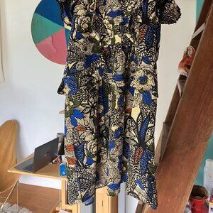 Dress in Cotton. Printed (Blue flowers). Unlined (not transparent). Backside keyhole.