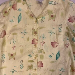 Dress Barn yellow short sleeve button down blouse with teacups and butterflies print had been gently worn and is in very good used condition (small red dot stain on front).