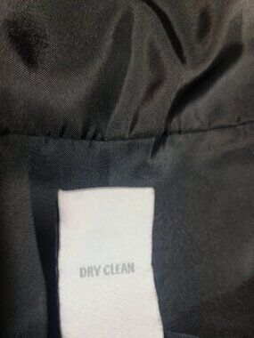 The jacket is very nice, good quality fabric. LAdies size M. Jacquared look , black,grey,white. Pockets on the front. Black lining. No holes, tears or rips anywhere on the jacket. The back of the jacket has a very nice decorative bow, the same color as the jacket. Medium weight material. Material , polyester,acrylic,wool, rayon, nylon and other fiber blocking. The lining is 100% nylon
