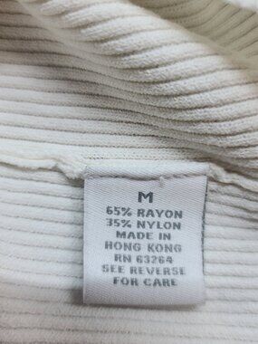 The top is a white sleeveless turtleneck , It hangs and wears really nice. LAdies size M. Very good quality material. It does stretch , and hold its shape after washing. No holes, tears or rips It is made of rayon and nylon. Lightweight.
