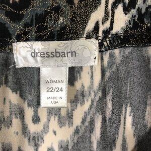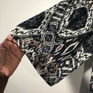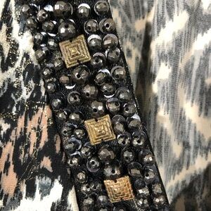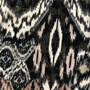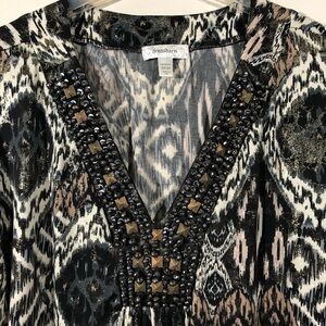 Abstract print blouse with gold tint, V neck, beading and gold studs around neckline. Pre-owned and in good condition.