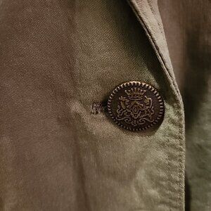 The Dress Barn Army Green Jacket Blazer in size 3x features gold buttons and a stretch material, making it a stylish and comfortable option for women. This military-style jacket is made of cotton with a polyester lining, perfect for everyday wear or special occasions. The jacket's plus size design and button closure add a touch of sophistication to the overall look, while the green color adds a trendy pop to any outfit. Perfect for adding a chic army-inspired flair to your wardrobe.