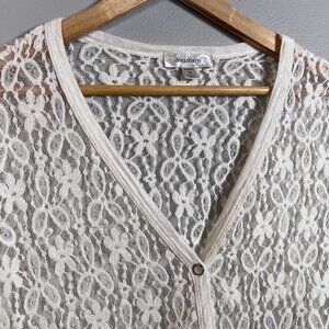Introducing a beautiful beige lace cardigan from Dressbarn, perfect for any occasion. This cardigan comes in size 1X. The pockets give it a unique touch, making it a great addition to any wardrobe. Hand wash only, this cotton blend cardigan is made in the United States and is suitable for both casual and business wear. It's a great option for travel, weddings, or any season of the year. Don't miss out on this versatile and stylish addition to your wardrobe!