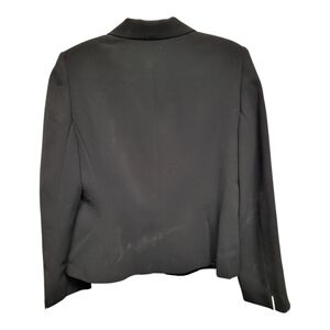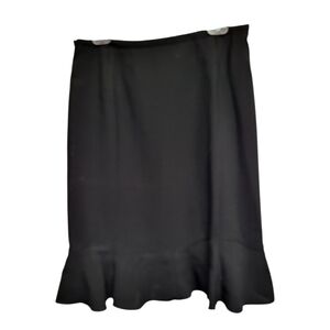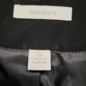 This Dress Barn suit showcases a refined, tailored design in a rich black color, ideal for formal occasions. Its structured silhouette and notched lapels provide a timeless and sophisticated appearance. The matching skirt features a subtly ruffled hem. Crafted with precision, this suit is a staple piece for any professional wardrobe.