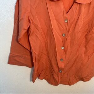 Good condition, minor wear. Dress Barn. button down blouse. V-neck. Rounded collar. 3/4 sleeve. Peach orange color. Shoulder pads. Size small. 55% rayon, 45% polyester. Pit to pit laying flat 17” Shoulder to hem 21” Sleeve (pit to hem) 12.5”. All measurements are approximate and taken lying flat. Smoke free home. No trades, offers welcome.