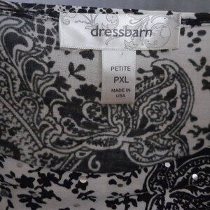 This scoop cowl-neck Dress Barn top with 3/4 sleeves has a very attractive black and white paisley floral design pattern with subtle sparkly sequins on the front and back. Size Petite XL. Polyester spandex fabric. Excellent like new condition.