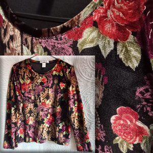 Dress Barn Elegant Stretch Velveteen Floral Pattern Long Sleeved Blouse Top Sz L