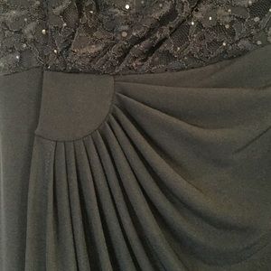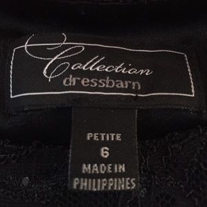 Dress Barn sleeveless LBD w/rounded neckline and bodice covered in sequined lace. Skirt is draped from a square fabric accent at a high waist. The dress is very flattering. It has some stretch, less in the bodice and more in the skirt. Size 6P. 36" from shoulder to hem.