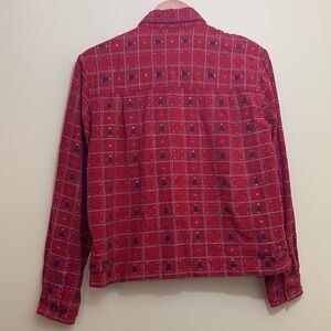 Dress Barn | Red Green Gold Plaid Metallic Thread Button Down Long Sleeve Cotton Embroidered Christmas Trees stars Shirt In size Medium with spare buttons in tact.