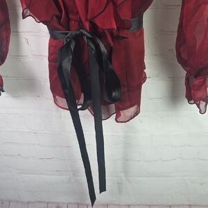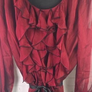 Dress Barn red blouse with layered ruffles. Sheer long sleeves. Perfect for stylish outings.