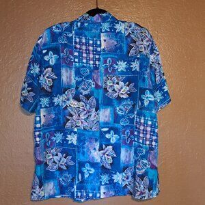 Pretty blue with purple floral Hawaiian vibe button down shirt, complete with shoulder pads.100% silk. Size large. Nice pre-loved condition.