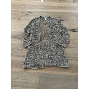 This cardigan is in excellent condition! There are no rips, tears, pulls, or stains. It is a pretty open front, crochet, open knit cardigan. It has three quarter length sleeves and hits about mid-thigh. You can easily dress this cardigan up for the office or for a date!