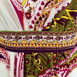 Embellished at the boat style neckline and waist with gold beads, beads and crystals, gold buttons on shoulders. Ties in back. No zipper , pull over head style. Ivory background with green, pink, black. Approximate measurements are pit to pit 16”, waist 14”, length from shoulder approximately 34”.