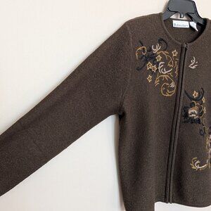 Dress Barn army green wool zip front sweater jacket embroidered floral Large EUC