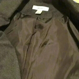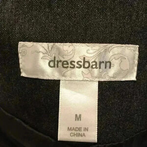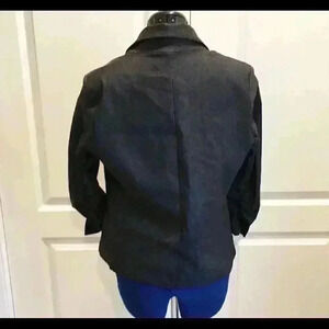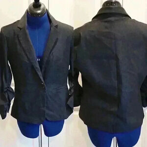 Dress Barn size M single breasted, ruched sleeve blazer in dark charcoal gray. Faux front pockets, lined. 40% rayon, 26% polyester, 22% nylon, 4% spandex. Lining is 100% polyester. Bust 19”, shoulder to hem 22”, sleeves 19”. All measurements are approximate. Excellent condition! No stains or signs of wear. See tag photo for best color representation. Thank you for coming by our closet. We are a fast shipper! F347 B8