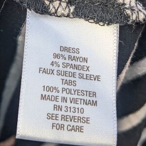 Cute black and grey striped dress from Dress Barn. Good condition minus light pilling, mostly at the armpits as shown in pic#7. Size 4. I love the button part on the arms.