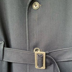 Mens Dress Coat with 70% Wool & 30% Nylon zip out lining, Navy blue coat with button and belt closure. Vintage, Very good condition. Large