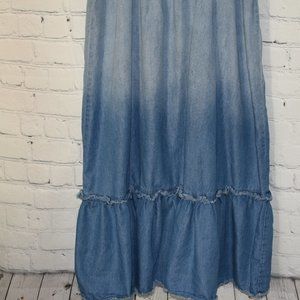 AUW denim off shoulder dress with ruffled tail. Removable shoulder straps. Size 10. Has belt loops but no belt. No stains. Great condition!
