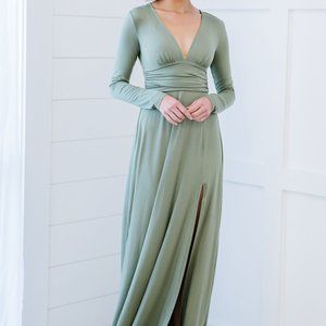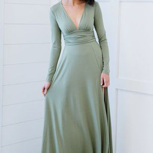 Stunning, comfortable, silky smooth olive khaki fabric is used on this long-sleeve, floor-length maxi dress with a thigh-high slit on the left side. Plunging V shaped neckline.