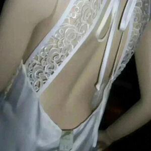 THIS BEAUTIGUL DRESS/GOWN, IS IN IVORY TAFFETA 100% POLYESTER LACE, 100% RAYON LINING, 100% ACETATE, IT DOES HAVE A SMALL RUST STAIN, WHICH I WAS TOLD IT IS EASILY CLEAN, SEE PICTURE, IT DOES BRING A SHAWL OF SAME DRESS MATERIAL!!!