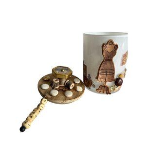 Dress Form Finery Glass Jar, Button Encrusted Lid Vanity Jar Suitcase SEW Trinke