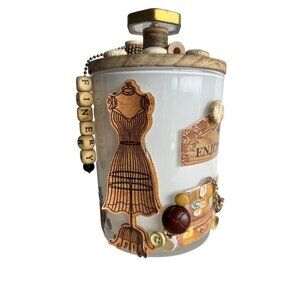 Dress Form Finery Glass Jar, Button Encrusted Lid Vanity Jar Suitcase SEW Trinket Keepsake Button Jar Unique One-of A-Kind Assemblage