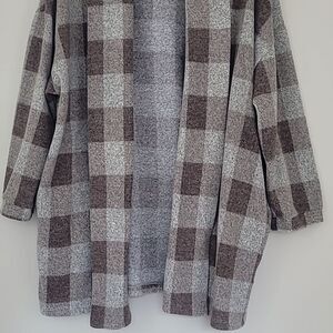 Dress Forum Brown & Gray Buffalo Plaid Open Front Shawl-Collar Cardigan with Pockets. Size Large. Excellent lightly loved condition.