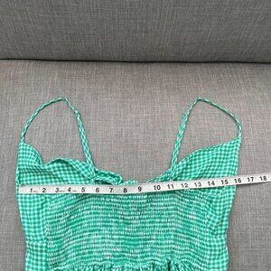 This fun and flirty green gingham print crop top features a v-neck with a tie front and spaghetti straps. There is a smocked panel on the back for extra stretch for added comfort. It is in EUC with no holes, rips, or stains. Measurements are shown in the pictures. Bundle with other items from my closet for the best deal!