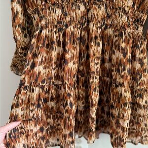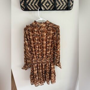 Beautiful iridescent leopard print mini dress with brown/orange/cream neutral coloring.