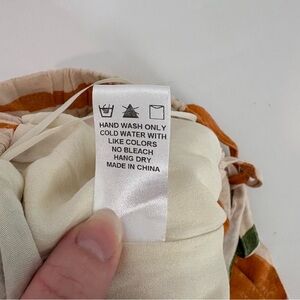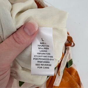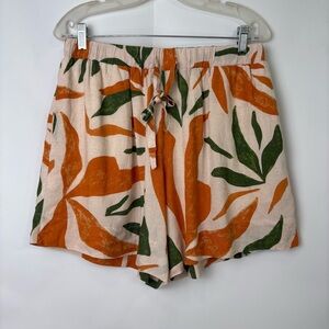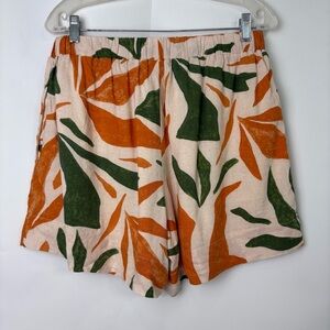 Stunning lined shorts with orange and green tropical print. Pull on elastic waist with drawstring. Linen blend. Size large. Waist about 15.25 inches laying flat. Plenty of stretch. About 13.75 inch rise and 4.5 inch inseam. Excellent condition with no defects.