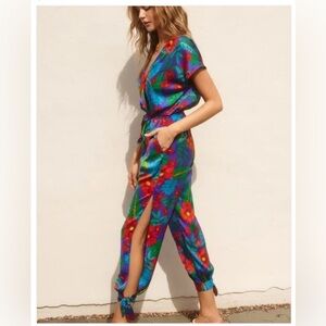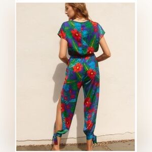 Dress Forum Satin Feel Tropical Print Split Leg Ties Jumpsuit size Small