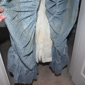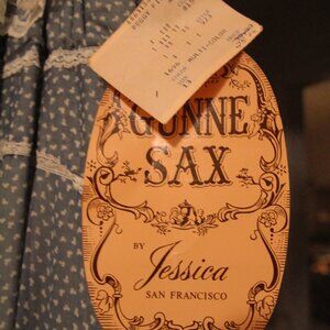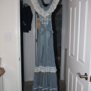 Vintage, blue and white with white lace, tiered, maxi Gunne Sax dress with liner. There is a matching attached tie belt. Zipper up the back. The size says it is a 13 but note the measurements which are more like a size medium: Chest ~ 36 inches around, waist ~29 inches around, back zipper 16 inches long, and total length of the dress from the top of the zipper is 153 inches. Outer layer 65% Polyester and 35% cotton, trim is 100% Nylon, and liner is 100% Nylon. Hand wash and lay flat to dry. In excellent condition still with tags. Gunne Sax by Jessica brand. Item 78A.