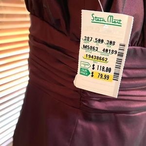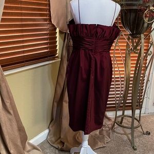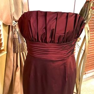 This beautiful dress has been me with a stunning burgandy material. The top of the dress has enough pleads to look beautiful , but not over done. Inside the top portion they have added bra cups whitch feels very comfortable. The with on the bust is 17", weist is 15" and the lenth on the dress from the ttop of the strap to the bottom is 41".
