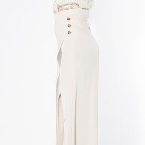 Long, flared trousers with a high waist. Features a front slit and asymmetrical chiffon layer. Has button embellishments and concealed back zipper.