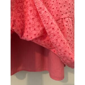 Cotton blend carnation or rose colored pink eyelet fabric over a lining. Size small v-neck sleeveless with flutter detail, pullover style, has POCKETS. See measurements in photos. Excellent pre-loved condition no rips stains or tears, smoke free home.