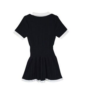 This short-sleeve knit dress features a contrasting white collar and cuffs, with a flattering pleated skirt design for a polished, timeless appeal.