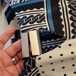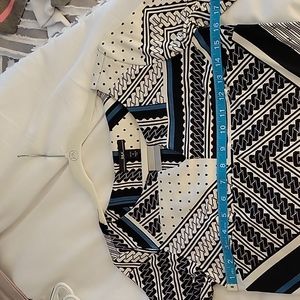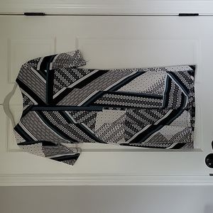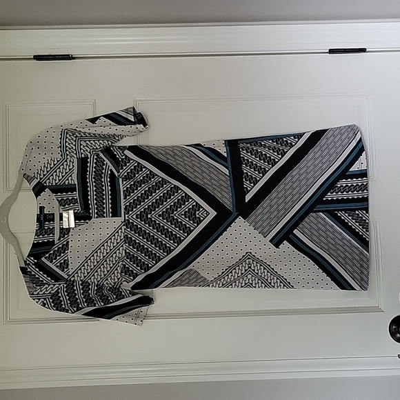 Dress by R&K, black, off white and some teal. Size PS, shoulder to hem 34", armpit to armpit 16". 95% polyester 5% spandex. very comfortable, lightly loved.
