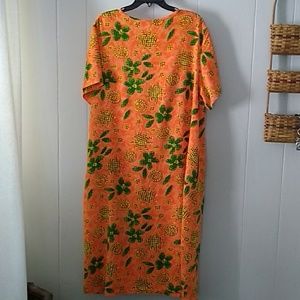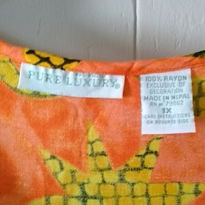 This bright and cheerful dress is size 1x androm shoulder was made in Nepal. Beautiful country. It is an orange tie dye background with flowers, stars, leaves and squiggly designs. Four buttons in front. Made of Rayon. Measures from shoulder seam to bottom 47 inches. Thanks for looking at my items for sell!