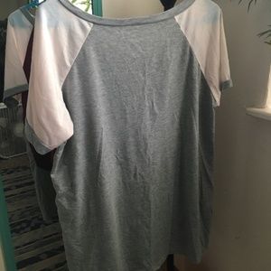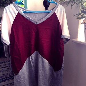 simple dress shirt with white/pale pink short sleeves. maroon middle and grey bottom. solid grey back. Cotton. Worn less than 5 times. No tag but fits like a medium / large. ( in home with pets all clean and washed before sent out )
