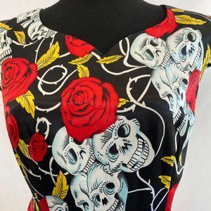 Dress Tells Black w/ White Skulls & Red Roses Satin Fit & Flare Rockabilly Dress NWOT Small