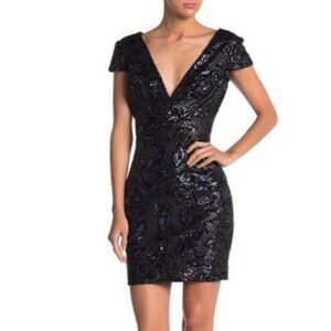Sparkly sequins decorate this signature woven mini dress with a plunging neckline and stylish cap sleeves.