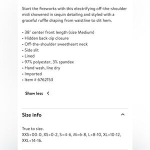 Start the fireworks with this electrifying off-the-shoulder midi showered in sequin detailing and styled with a graceful ruffle draping from waistline to slit hem.