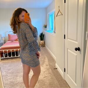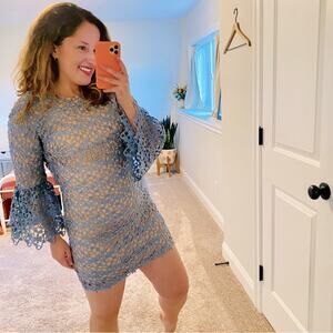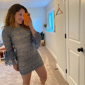I am so in love with this stunning designer Dress the Population blue and tan lace floral sexy long sleeve mini dress
