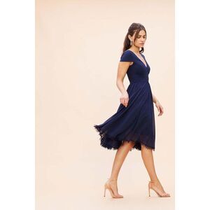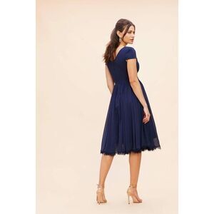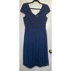 Dress in Midnight Blue. Size M but fits like a small website recommends sizing down one size. The charming but sophisticated Corey Dress pairs a fitted crepe bodice with a softly gathered chiffon skirt.