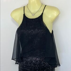 FROM DRESS THE POPULATION HERE IS AN ELEGANT AND SO SEXY MINI COCKTAIL DRESS IT IS A POLY/SPANDEX BLEND SO IT DOES HAVE STRETCH. THIS DRESS FEATURES SPAGHETTI STRAPS AND A BACK ZIP. IT IS DONE IN BLACK AND ADORNED WITH BLACK SEQUINS. IT HAS A FABULOUS ATTACHED SHEER BLACK PEPLUM OVER THE BODICE. SZ XS NEW WITH NORDSTROM TAG STILL ATTACHED! WONDERFUL FOR UPCOMING HOLIDAY PARTIES! PLEASE NOTE THE MEASUREMENTS