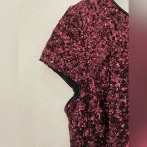 Dazzle in this burgundy sequin midi dress. Features cap sleeves and a fitted silhouette with stretch. Zip back, slit, lined